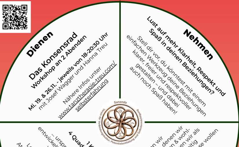 In einer kleinen Gruppe bis max. 10 Personen üben wir die vier Rollen des Konsensrades, das uns auf eindrückliche Art und Weise zeigt, welche Rollen wir während einer Berührungssession einnehmen können.
